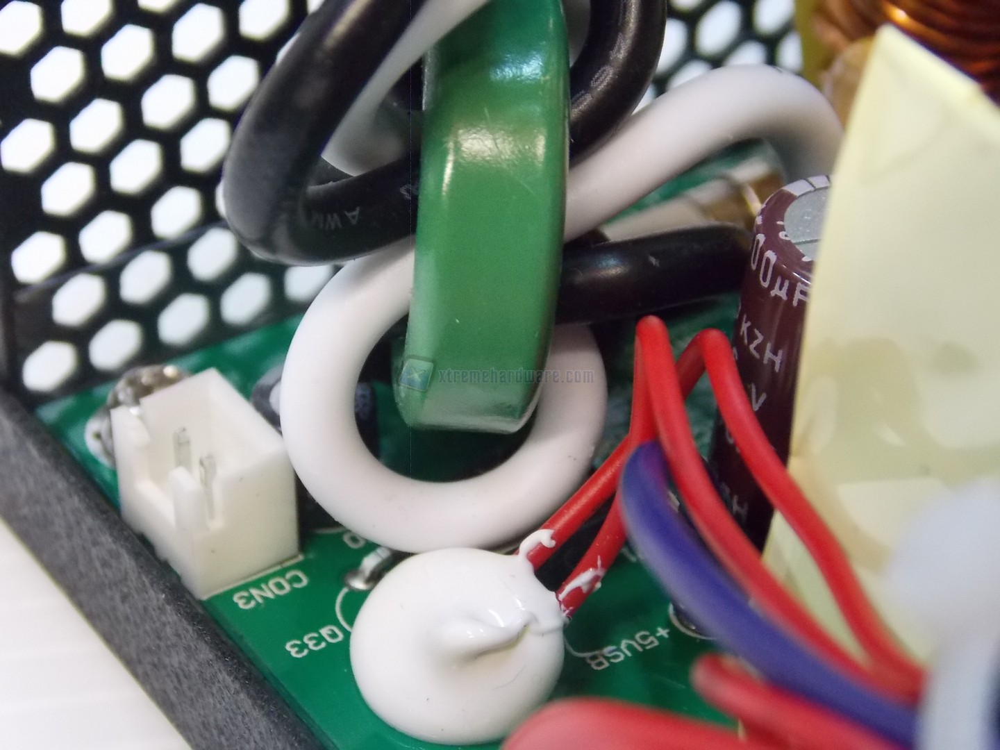 Una volta rotto il sigillo di protezione, ed aperta l'unità, possiamo notare la componentistica interna. L'unità è prodotta da Enhance, e ciò si rende particolarmente evidente per via di alcuni dettagli peculiari. Nel primario viene utilizzata una topologia Full-Bridge, con un convertitore LLC Resonant, che appunto permette uno standard qualitativo tra i più alti sul mercato. Sebbene l'unità presenti il minore wattaggio della serie, la qualità complessiva stando alle componenti utilizzate, si attesta su livelli elevati. Cominciamo dall'analizzare lo stadio primario, e le protezioni in ingresso. Il primo elemento di un alimentatore moderno è il sistema di filtraggio delle emissioni elettromagnetiche e radio, precisamente l’EMI/RFI Transient Filter. Viene posizionato necessariamente dietro all’ingresso della corrente AC. In questa unità troviamo, posizionato direttamente dietro all'ingresso, due condensatori ad X e due ad Y, mentre sul PCB principale troviamo invece altri due condensatori ad X, due a Y, due induttori toroidali ed un TVS, che va a sostituire il classico MOV (reference: http://powerelectronics.com/regulators/selecting-protection-devices-tvs-diodes-vs-metal-oxide-varistors?page=3).