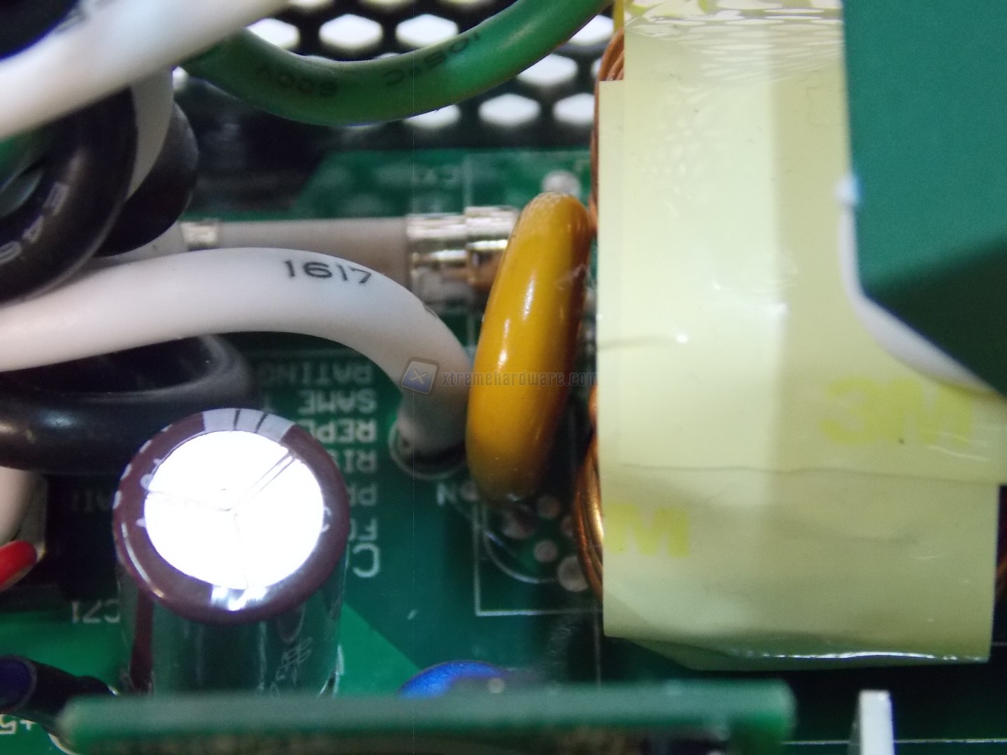 NOTA GENERICA: i condensatori del circuito primario agiscono come buffer e sono molto importanti perché la loro presenza aiuta a proteggere il nostro alimentatore ed il computer stesso da pericolosi sbalzi di tensione e generalmente vengono collegati in parallelo al fine di sommare le singole capacità o, alternativamente, per modelli meno potenti. La tipologia dei condensatori utilizzata è quindi molto importante perché la vita di queste componenti si dimezza in base all’aumento della temperatura di ogni 10 gradi Celsius, sotto un normale carico di lavoro; questo significa che utilizzando modelli di condensatori capaci di gestire, senza il minimo problema anche 105 gradi Celsius, la durata della loro vita potrebbe essere addirittura pari al doppio rispetto a modelli standard da 85 gradi Celsius! Questo fattore è uno dei più sponsorizzati nel campo degli SMPS, non a caso ci si vanta della presenza di condensatori giapponesi nella propria unità, capaci appunto di sopportare temperature maggiori e quindi prolungare la vita stessa dell’unità.