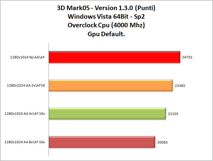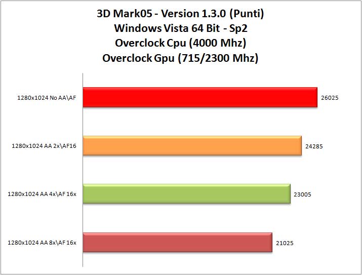 Il 3DMark05 è un programma di stress test per schede video .Basato sulle specifiche "DX9c", questo test richiede la presenza di una scheda compatibile con le specifiche Pixel Shader 2.0 o superiori.Il test viene fatto alla risoluzione nativa di 1024*768 sia sotto Windows Vista 32Bit SP1, che Windows XP 32 Bit SP3.